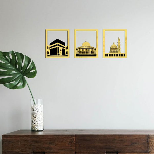 Set Of 3 Masjid Al-Haram - Masjid Al-Aqsa & Masjid An-Nabawi Wall Decor Wall Sticker Muslim Acrylic Mirror Wooden Room Decor (Golden)
