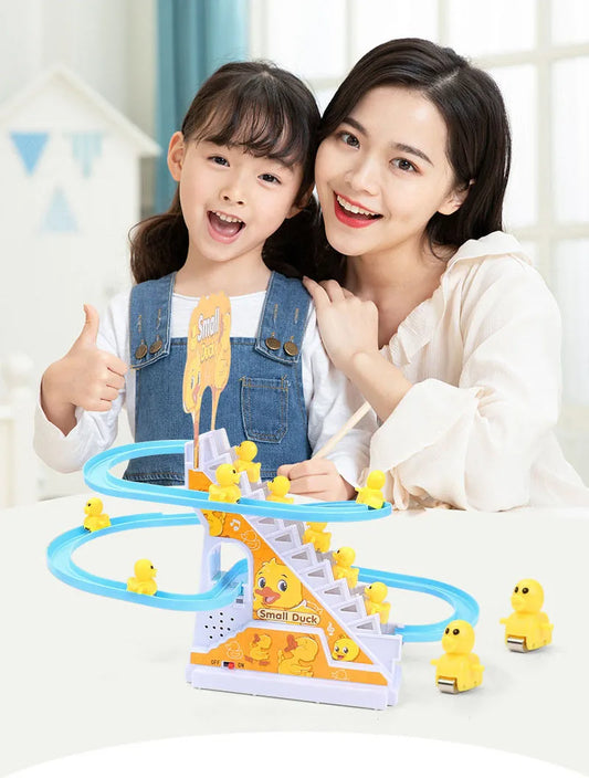 Small Ducks Climbing Toys, Electric Ducks Chasing Race Track Game Set, Playful Roller Coaster Toy with 3 Duck LED Flashing Lights & Music Button, Fun Duck Stair Climbing Toy for Toddlers